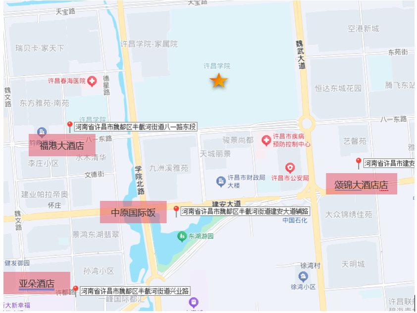 (1)中原国际饭店 地址:许昌魏都区建安大道与学院北路交叉口向东300米;联系电话:0374-8389999