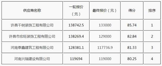 3、采购人确认成交供应商:许昌千树装饰工程有限公司,成交金额:133000元,地址:许昌市魏都区文峰办事处长青街盛世嘉苑16幢1层。