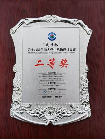 10月15日至19日,“建行杯”第十八届全国大学生结构设计竞赛在绍兴文理学院举办。由bet36体育在线土木工程学院教师张磊、焦玲指导,2023级学生赵亚磊、王丹妮、王荔超组成的“船承使命”队从全国总决赛的激烈竞争中脱颖而出,最终斩获全国二等奖。