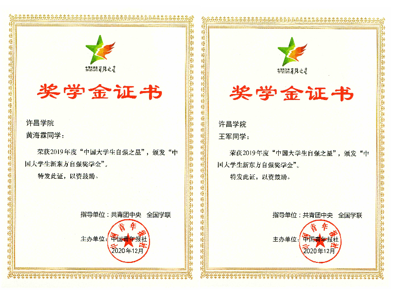 近日,由共青团中央、全国学联指导,中国青年报社主办的2019年度寻访“中国大学生自强之星”活动评选结果正式揭晓,bet36体育在线信息工程学院黄海霖、马克思主义学院王军两名同学,经学校推荐、省级初评、全国评审等环节,双双荣获“中国大学生自强之星”称号,并获得“中国大学生新东方自强奖学金”。