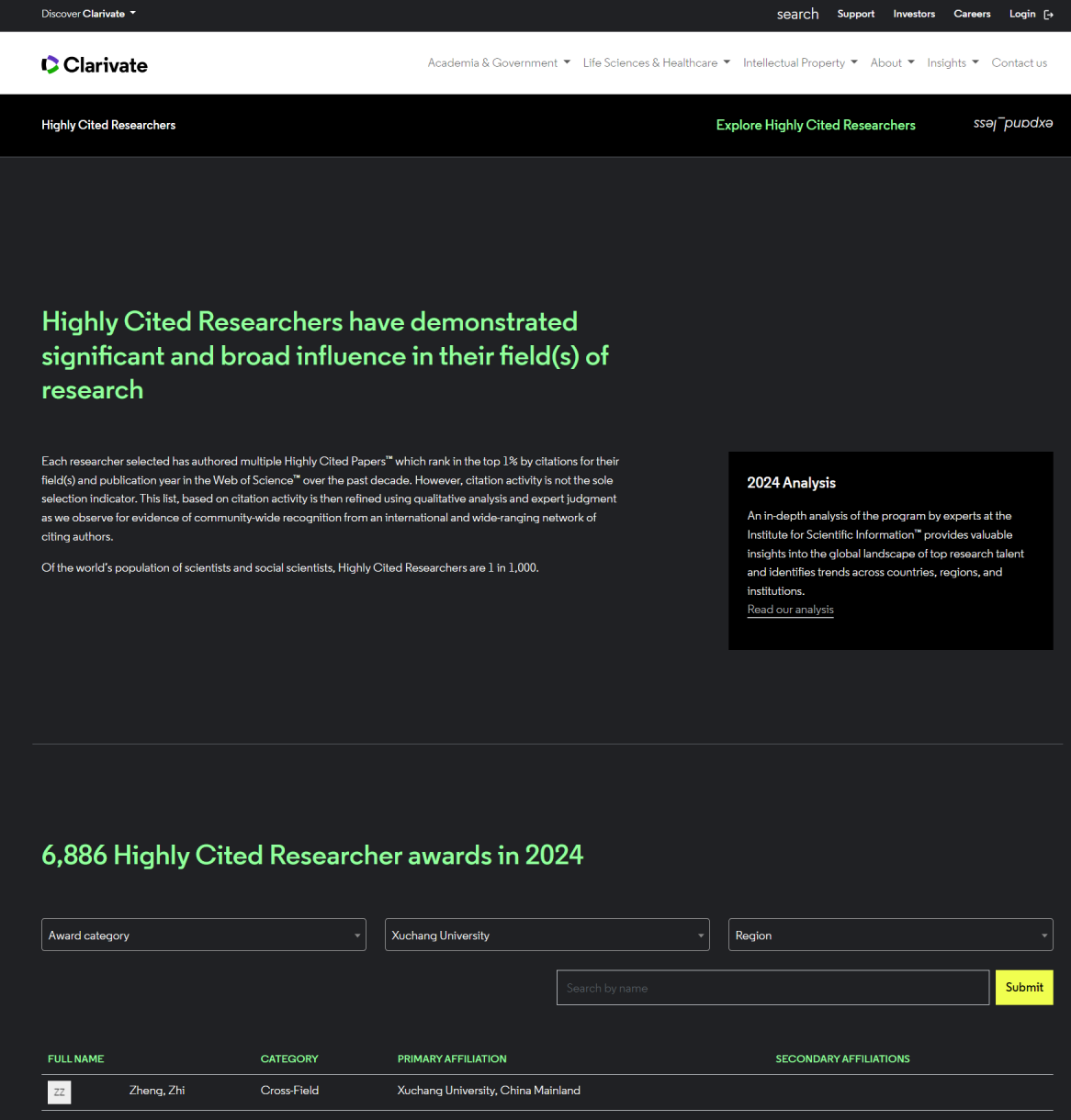近日,科睿唯安(Web of Science数据库)、美国斯坦福大学(Stanford University)先后发布了2024年度“全球高被引科学家”名单和2024全球前2%顶尖科学家榜单(World's Top 2% Scientists)。其中,bet36体育在线校长郑直教授入选2024年度“全球高被引科学家”(“交叉学科”领域),成为bet36体育在线首位入选“全球高被引科学家”榜单的学者,化工与材料学院(表面微纳米材料研究所)许志红教授与何伟伟教授两位学者入选化学领域2024年度科学影响力榜单,其中何伟伟教授也是连续五年入选全球前2%顶尖科学家榜单。
