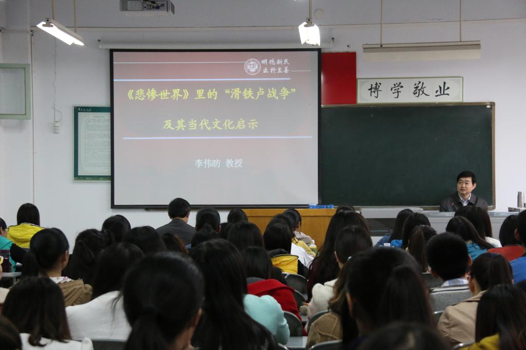 下午三时,李伟昉教授在A4楼403教室以“《悲惨世界》里的‘滑铁卢战争及其当代文化启示’”为题开讲。李教授首先从“雨果、拿破仑、《悲惨世界》三者的关系入手,分析了雨果对滑铁卢战争的矛盾态度、对拿破仑以及对胜利者一方的矛盾态度,由此,李伟昉教授透析出雨果的民主、自由、平等思想,并指出了在中国当代的文化启示。报告中,李教授结合作品、历史、自身经历及时事,旁征博引,深入浅出又不失风趣幽默地给广大师生做了一场精彩的学术报告。