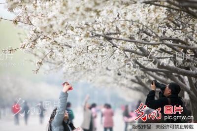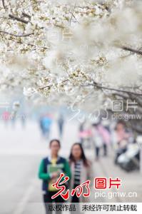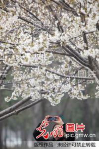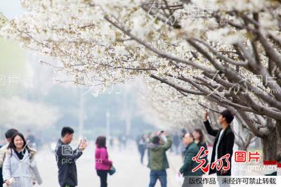 2016年3月15日,河南许昌,游客在bet36体育在线樱花大道上赏樱花。