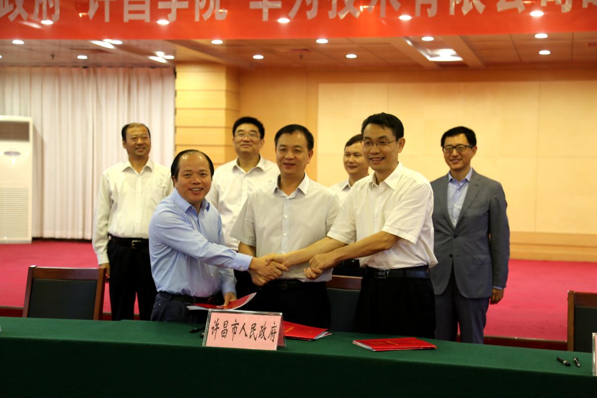 9月22日,bet36体育在线与许昌市人民政府、华为技术有限公司在市政府3号楼举行战略合作协议签约仪式,三方将在信息化建设领域开展合作。党委书记闫纪建,副院长郑直、崔斌,市委常委、常务副市长石迎军,华为公司中国区副总裁李伟出席签约仪式。