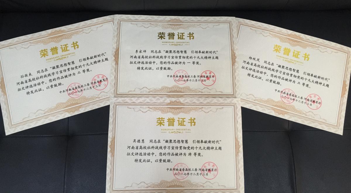 河南省委高校工委、省教育厅为进一步推进学习宣传贯彻党的十九大精神活动的深入开展,在全省高校社科战线组织开展了“凝聚思想智慧 引领奉献新时代”学习宣传贯彻党的十九大精神主题征文活动。bet36体育在线高度重视,积极组织,严格把关,最终推荐申报的马克思主义学院吴德慧老师的论文《新时代开启新征程的政治宣言》荣获特等奖,马克思主义学院李家祥老师的论文《真理原则与价值原则的完美统一》荣获一等奖,法政学院孙敬良老师的论文《践中共之引领,搏中华之复兴》和交通运输学院杨枝茂老师的论文《绿色经济视角下河南省企业环境责任实现路径研究》荣获二等奖。