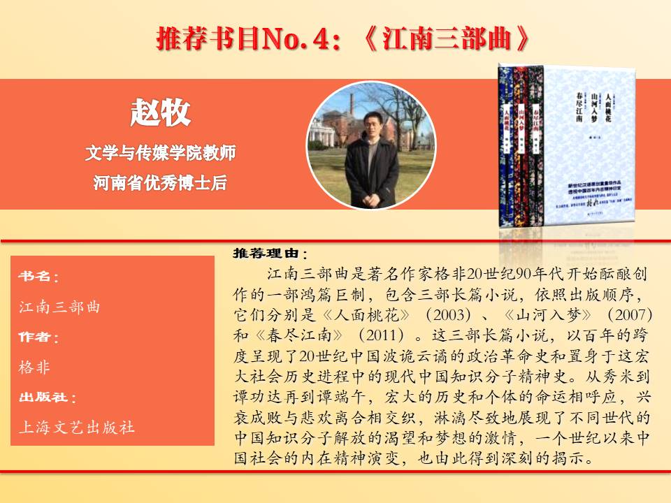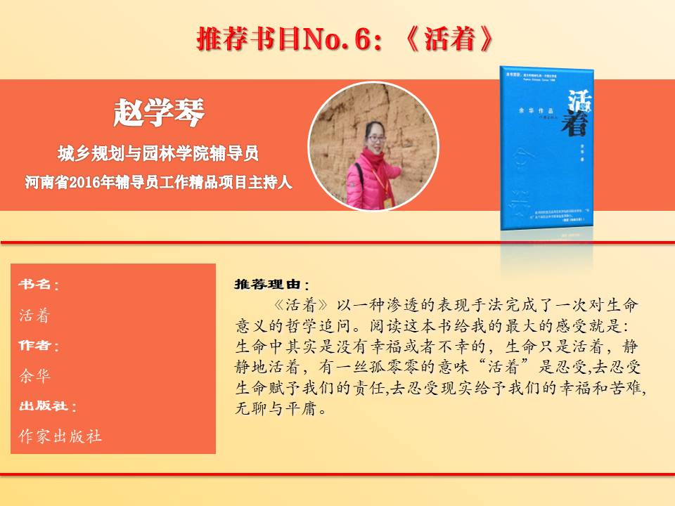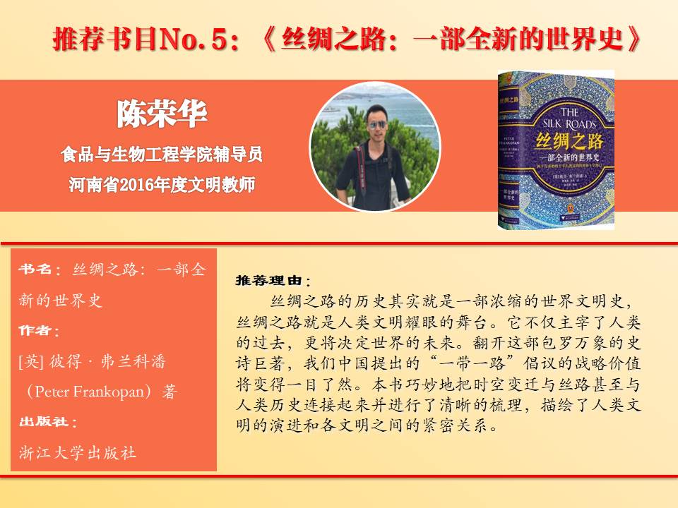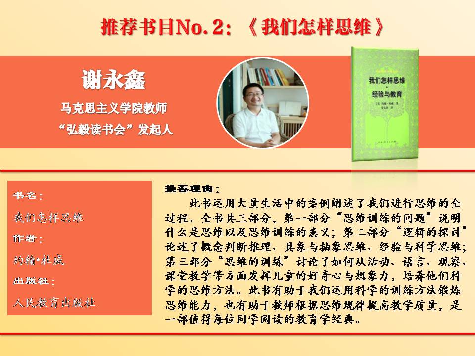 【编者按】为进一步激发全校师生爱读书、会读书、读好书的浓厚兴趣,努力营造书香校园的良好氛围,校党委宣传部(新闻中心)今年继续策划推出荐书专题活动。本期“师长荐书”和“学长学姐荐书”专题活动,特别邀请8位教师和8位同学精心推荐图书16本,在学校官方网站、官微等平台同步推送,敬请关注。