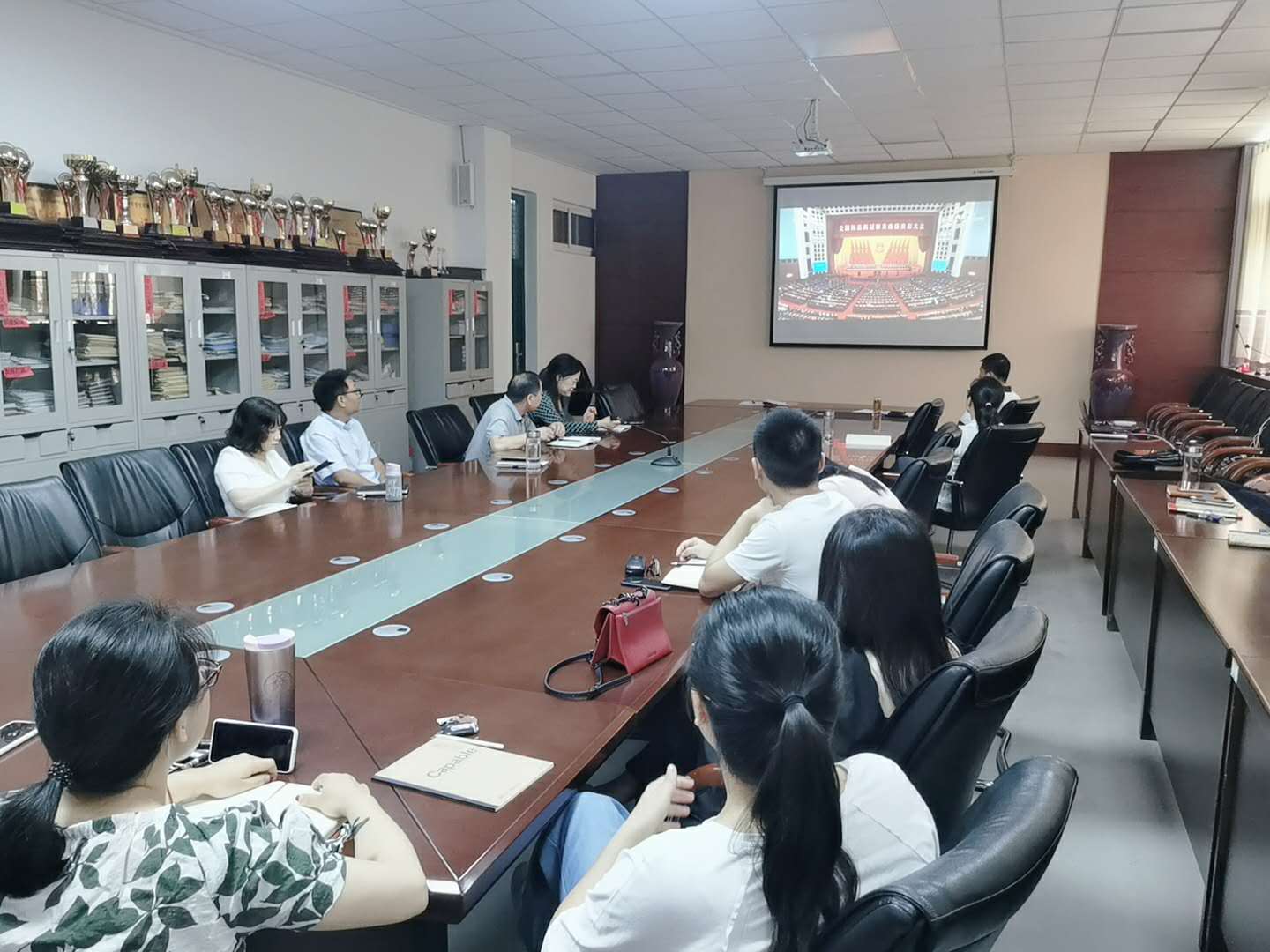 校级领导闫纪建、岳修峰、孙海、郭涛、黄怡俐、周新峰、高金星、潘春彩和机关党委党员干部在办公楼第三会议室集中收看了实况直播。各单位各部门师生员工分别利用网络、广播、电视、新闻客户端等多种形式认真收听收看大会,聆听习近平总书记发表的重要讲话。
